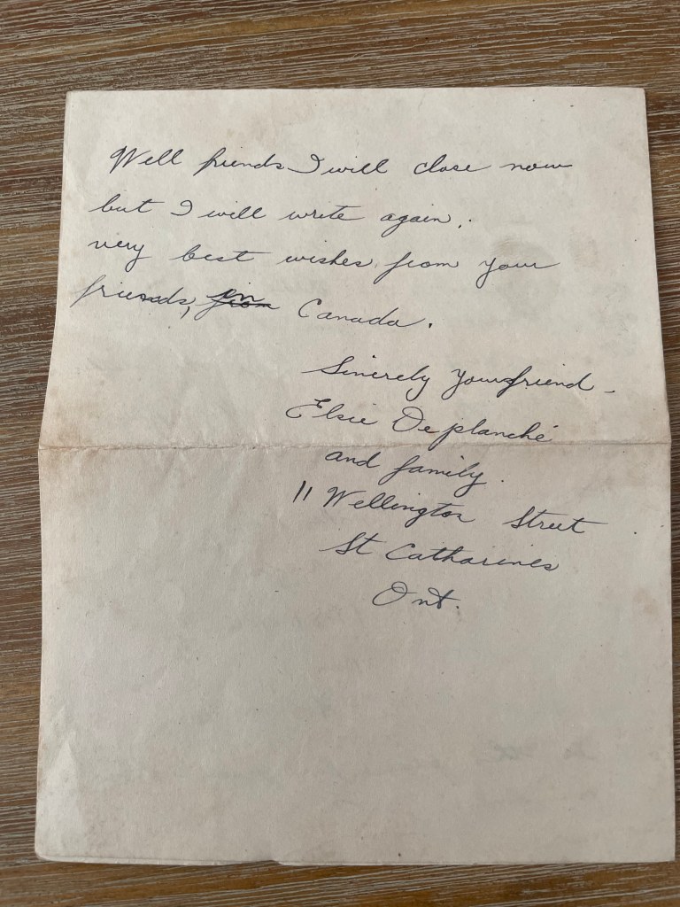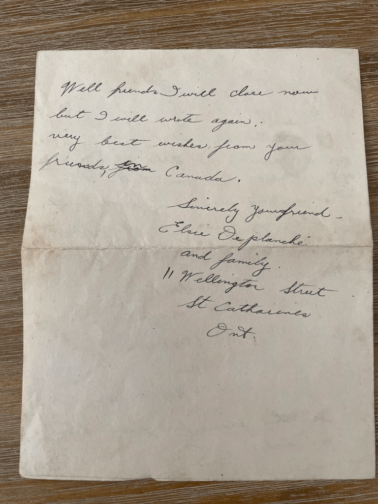 But these well-kept treasures are now revealed to me. After Mrs. Bratherton’s letter, I find letters from Elsie DePlanché and even a short message from….. “Red” Shorrock.