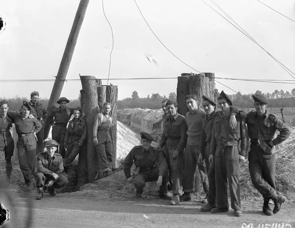 Photo: Personnel of The Irish Regiment of Canada standing in front of a German roadblock and anti-tank ditch, near Otterloo, Netherlands, 16 April 1945.