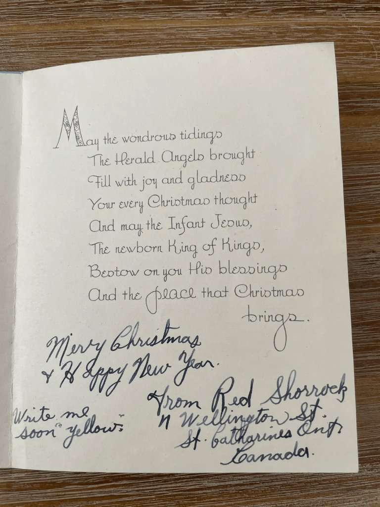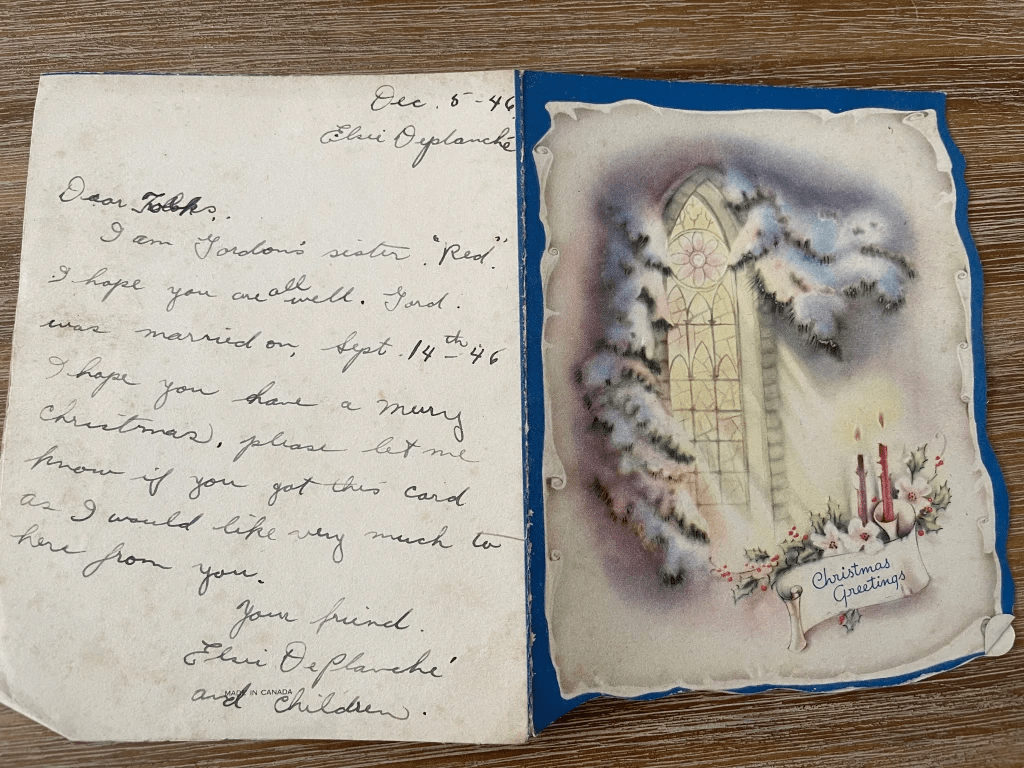 I thank Gordon’s son for the contact we now have. It is very dear to me. He has confirmed that the handwriting on the Christmas card to my father is his father’s handwriting.