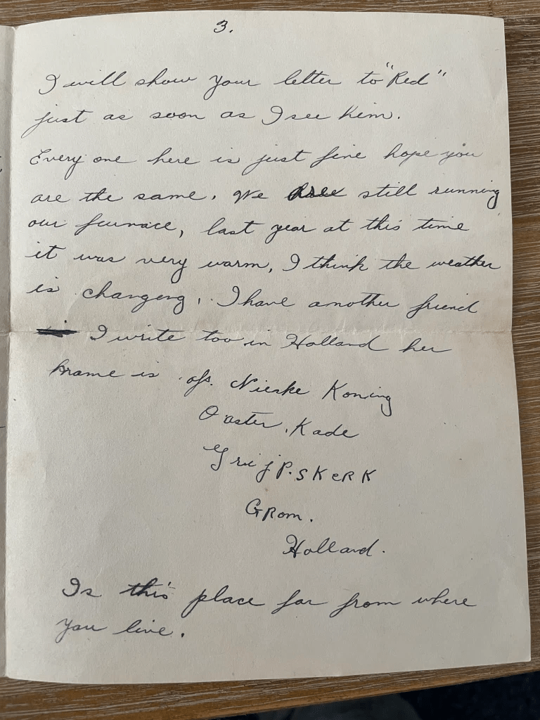 I received our most welcome letter a week ago, but I am very sorry I can’t read Dutch. But a friend of mine married a Dutch girl, and she just came over here about a month ago, so she wrote it in English for me. I would like it very much if you would exchange pictures with me, I will send a picture a little later, also something that is very hard for you to get over there.