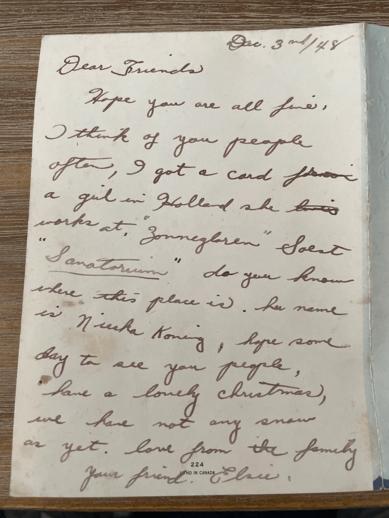 I hope you are all fine. I think of you people often. I got a card from a girl in Holland. She works at She works at ‘Zonnegloren sanatorium, Soest’. Do you know where this place is? Her name is Nienke Koning. Hope some day to see you people. Have a lovely Christmas. We have not any snow yet.