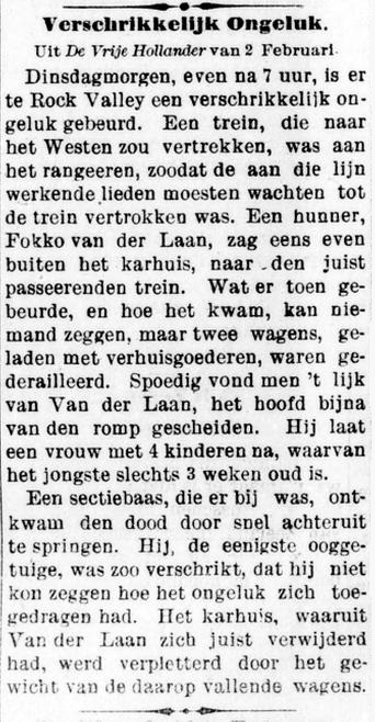 “De weduwe van Fokko van der Laan, den man die verleden winter in het sectie huis te Rock Valley door het derailleeren eener trein gedood werd, heeft tegen de C. M. and St. P. Ry. een eisch voor $15.000 schadevergoeding ingesteld.”