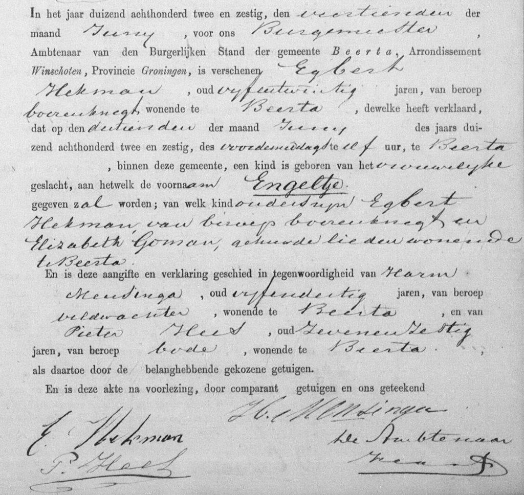 Engeltje Egberts Hekman, daughter of Egbert Hekman and Elizabeth Goman, is born June 13, 1862, in Beerta, a small village in the east of the Groningen Province, the Netherlands. She is the first born of eight children. One sister dies at age two.