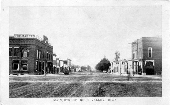 Rock Valley is named after the Rock River which runs through northwest Sioux County in Iowa. In the summer of 1879, the town of Rock Valley was platted by Colonel A.J. Warren, a Civil War veteran, and the Chicago Milwaukee & St. Paul Railway Company on ground owned by Warren. He laid out extra wide streets and planted many shade trees along the streets, which he watered himself by using a horse-drawn wagon with barrels of water on it.
