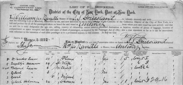 Het is 8 maart 1892. Er ligt een schip aangemeerd bij Ellis Island, New York. Het is de “SS Friesland” met aan boord emigranten uit Europa die in de nieuwe wereld, Amerika, een beter leven hopen te vinden.